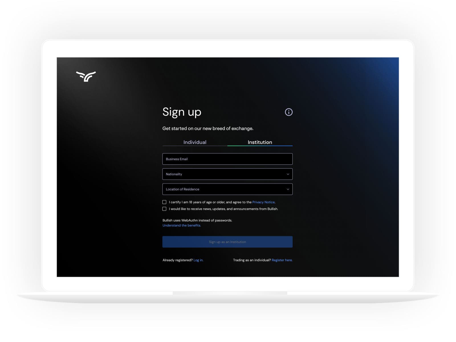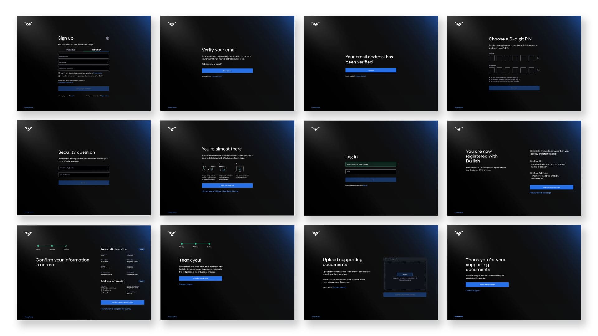 The challenge was to create a good user experience for institutional clients to get on board and start trading in the crypto exchange. There are many manadatory steps in the process of onboarding new clients and all legal requirements must be met. The expected outcome was to have an intuitive onboarding journey for institutional clients that is legally compliant.